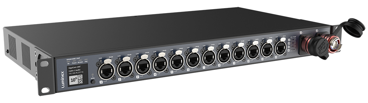 GigaCore 16tf 是 Luminex GigaCore 系列中的一款智能光纖交換機,用于演藝文娛行業(yè)的AV 系統(tǒng)集成、安裝和巡演。憑借其10Gb 連接,GigaCore 16tf允許燈光照明控制、音頻、內(nèi)通和視頻控制信號的完全網(wǎng)絡融合,還提供一系列 1Gb 版本,具有相同的 PoE 和冗余功能。 出廠預配置的QoS、 IGMP 和 PTPv2 設置將為 Dante?、AES67、Q-SYS 等要求最苛刻的時間關鍵型音頻協(xié)議提供響應迅速且極其穩(wěn)定的網(wǎng)絡連接環(huán)境。最高支持 POE++標準,可全方位驅(qū)動任何專業(yè)的 POE 設備,如云臺攝像機、大功率揚聲器等,設備已做完備的出廠設置,無需用戶掌握任何復雜的 IT 技能即可開箱即插即用。